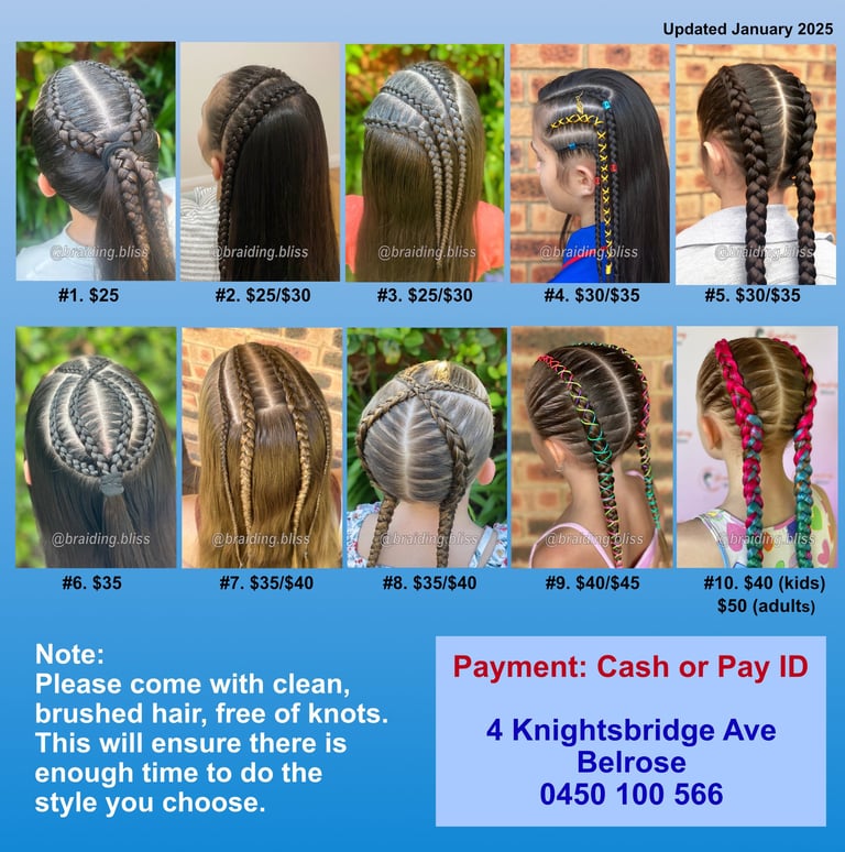 The prices listed are for top braid styles, typically designed for those with shaved sides and back. They take between 40-100 minutes. Please indicate which # you want.