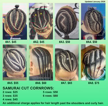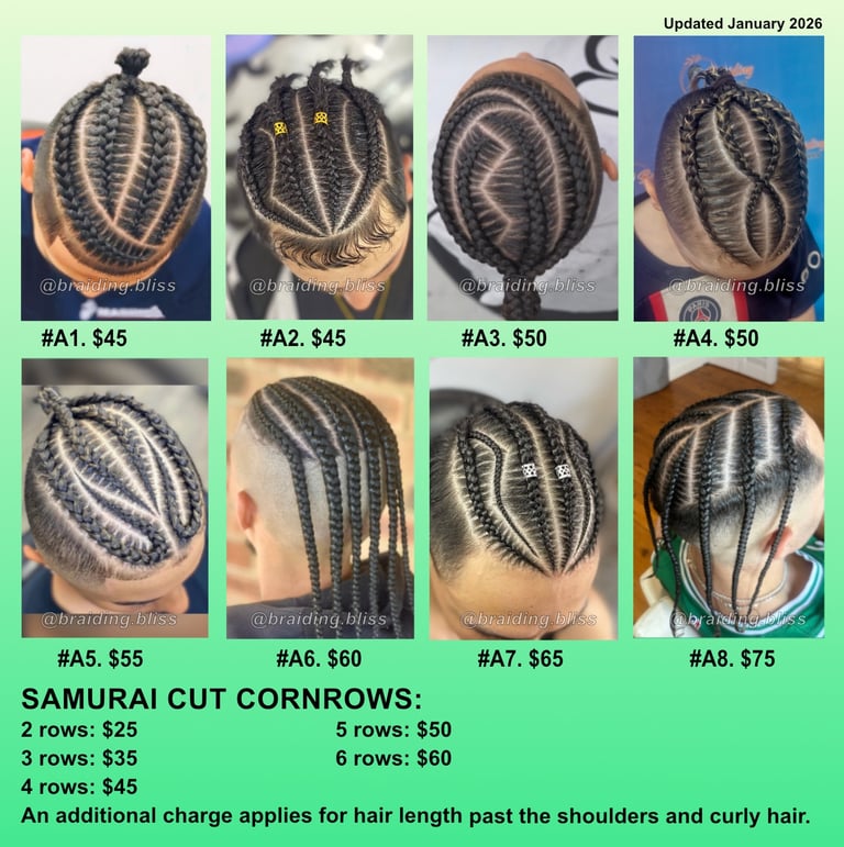 The prices listed are for top braid styles, typically designed for those with shaved sides and back. They take between 40-100 minutes. Please indicate which # you want.